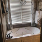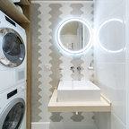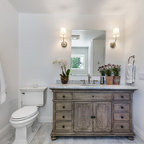 サンフランシスコのカントリー風おしゃれな子供用バスルーム (横長型シンク、白いタイル、サブウェイタイル) の写真 — Houzz