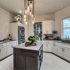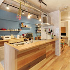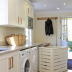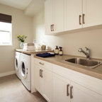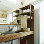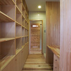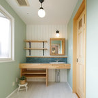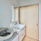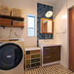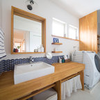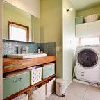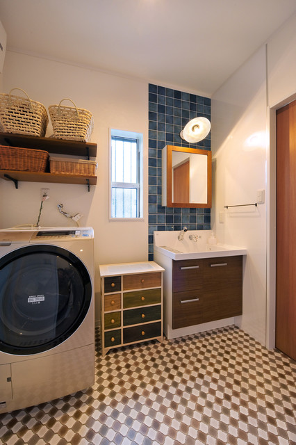 他の地域のアジアンスタイルのおしゃれなランドリールーム (フラットパネル扉のキャビネット、濃色木目調キャビネット、白い壁、マルチカラーの床) の写真 — Houzz