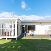 窓を開けるとリビングと一体化するウッドデッキ。