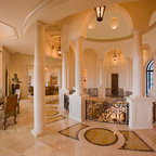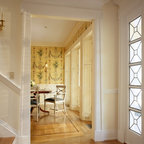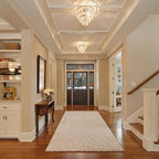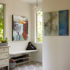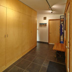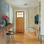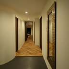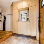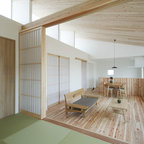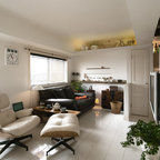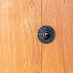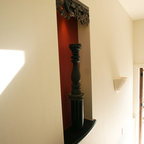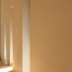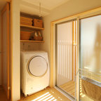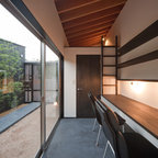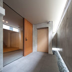 他の地域の片開きドアアジアンスタイルのおしゃれな玄関 (白い壁、コンクリートの床、木目調のドア、グレーの床) の写真 — Houzz