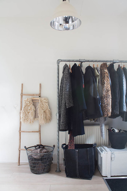 Pipe hanging, pulses use box storage below for hats, mittens, etc