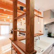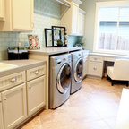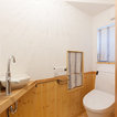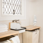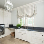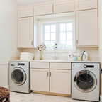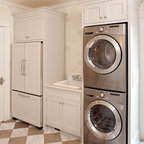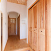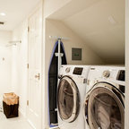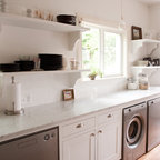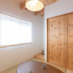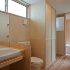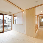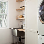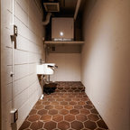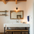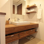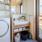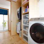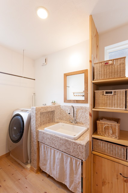 他の地域のアジアンスタイルのおしゃれなランドリールーム (オープンシェルフ、白い壁、無垢フローリング、茶色い床) の写真 — Houzz