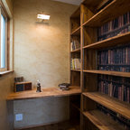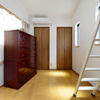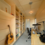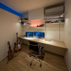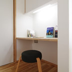 横浜のモダンスタイルのおしゃれなホームオフィス・仕事部屋 (白い壁、コンクリートの床、造り付け机、グレーの床) の写真 — Houzz
