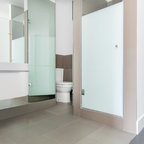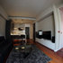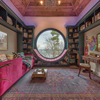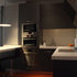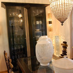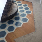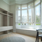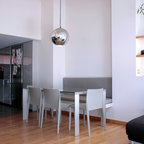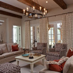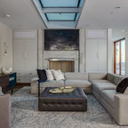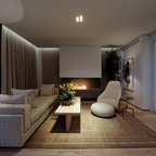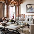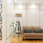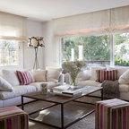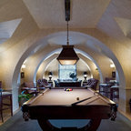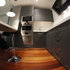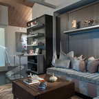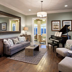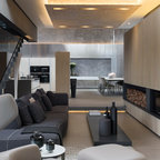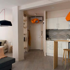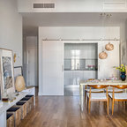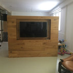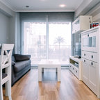 ビルバオの小さいトランジショナルスタイルのファミリールームの画像 (ホームバー、ベージュの壁、無垢フローリング、埋込式メディアウォール、LDK) — Houzz