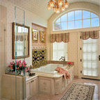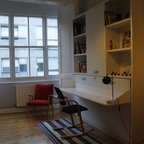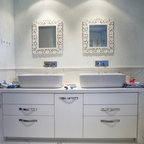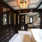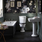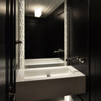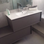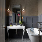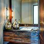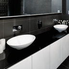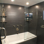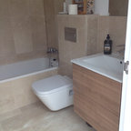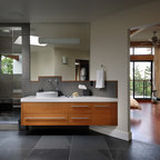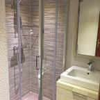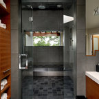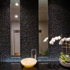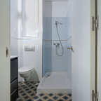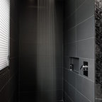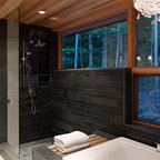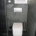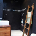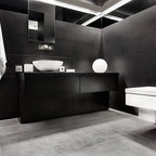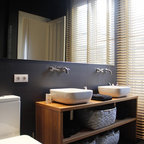 ビルバオの中サイズのトランジショナルスタイルのバスルーム (浴槽なし)の画像 (オープン棚、中間色木目調キャビネット、コーナー設置型シャワー、分離型トイレ、ベッセル式洗面器、木製洗面台、黒いタイル、セラミックタイル、黒い壁、セラミックタイルの床、黒い床) — Houzz