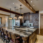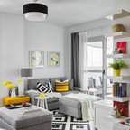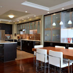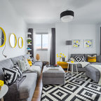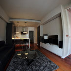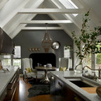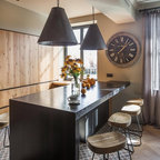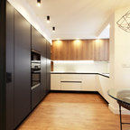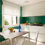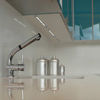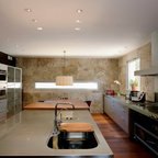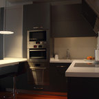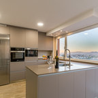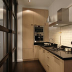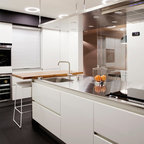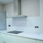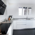 ビルバオの中サイズのL型コンテンポラリースタイルの独立型キッチンの画像 (アンダーカウンターシンク、クオーツストーンカウンター、セラミックタイルの床) — Houzz